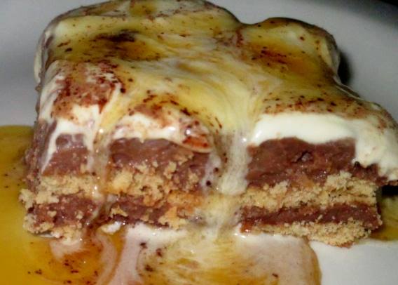 Pak beskuitjies in bak, gooi karamel mengsel oor dan sjokolade, pak weer beskuitjies ens tot beslag klaar is. Eindig af met die karamel en sjokolade.