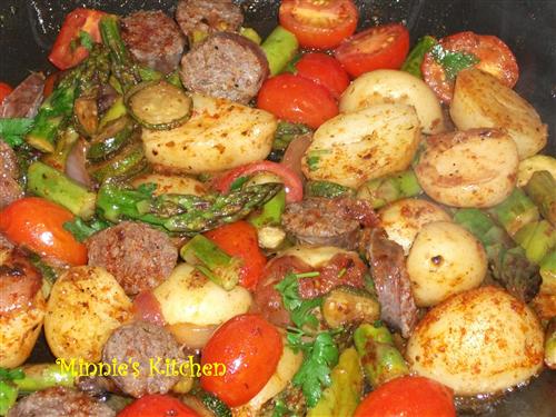 Gooi die wors by die groentemengsel en dan in ‘n oondvaste bak