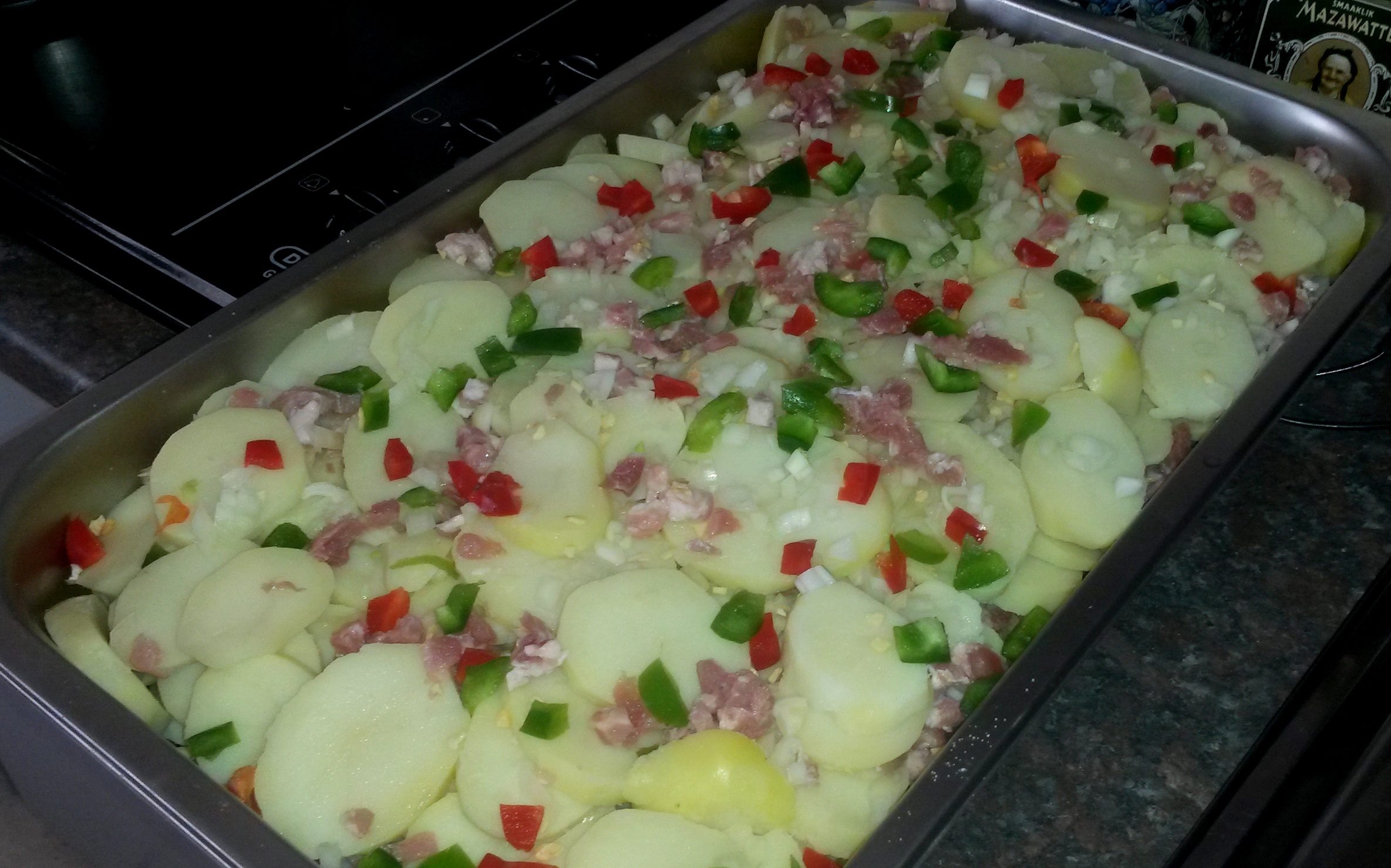 Pak lae aartappels, uie en spek. Ek het so bietjie knoffelvlokkies, sout en peper tussen die lae ingegooi