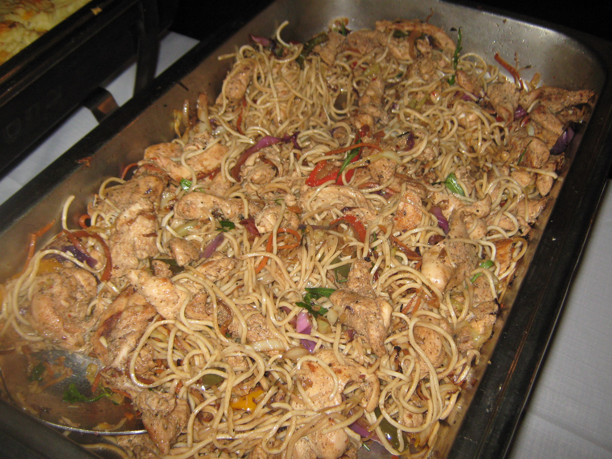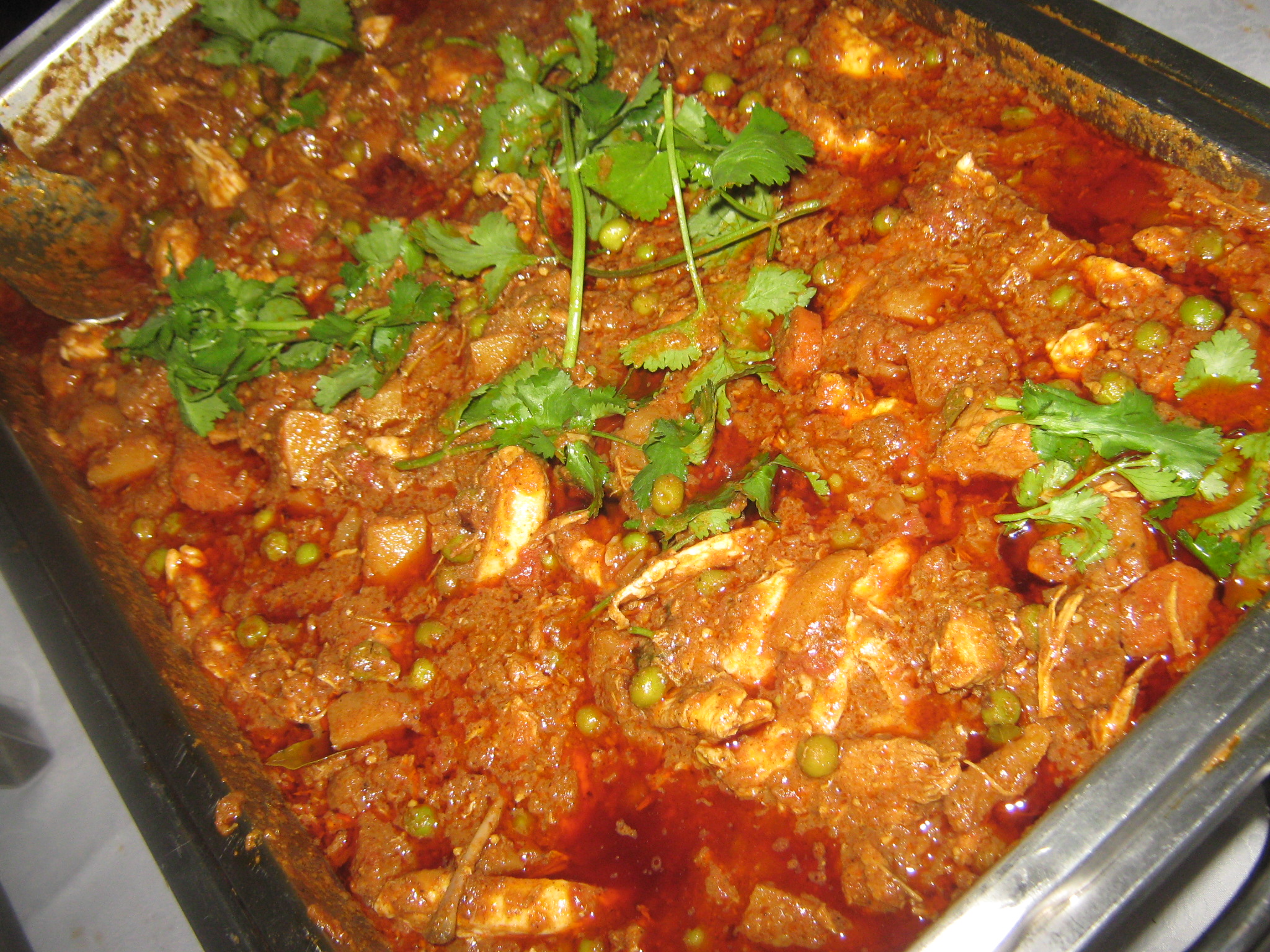 Ek het by bogenoemde resep van die spagetti en hoenderpan by die kok gaan vlerksleep, maar hy wou nie regtig die resep gee nie, maar hy het so vinnig verduidelik dat dit hoender is wat sag gekook is, dan braai jy groen/rooi en geel rissies in repe gesny, gekerfde rooi en groen kool en skywe uie tot sag in botter. Gooi masala oor en roerbraai. Voeg die hoender stukke by en bietjie hoender aftreksel  en kook  deur. Geur met sout en peper.