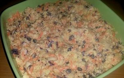 Kerf kool fyn, sny die vrugte in stukkies en meng met kool of was droe vrugte en meng met kool Gooi slaaisous or en meng goed.