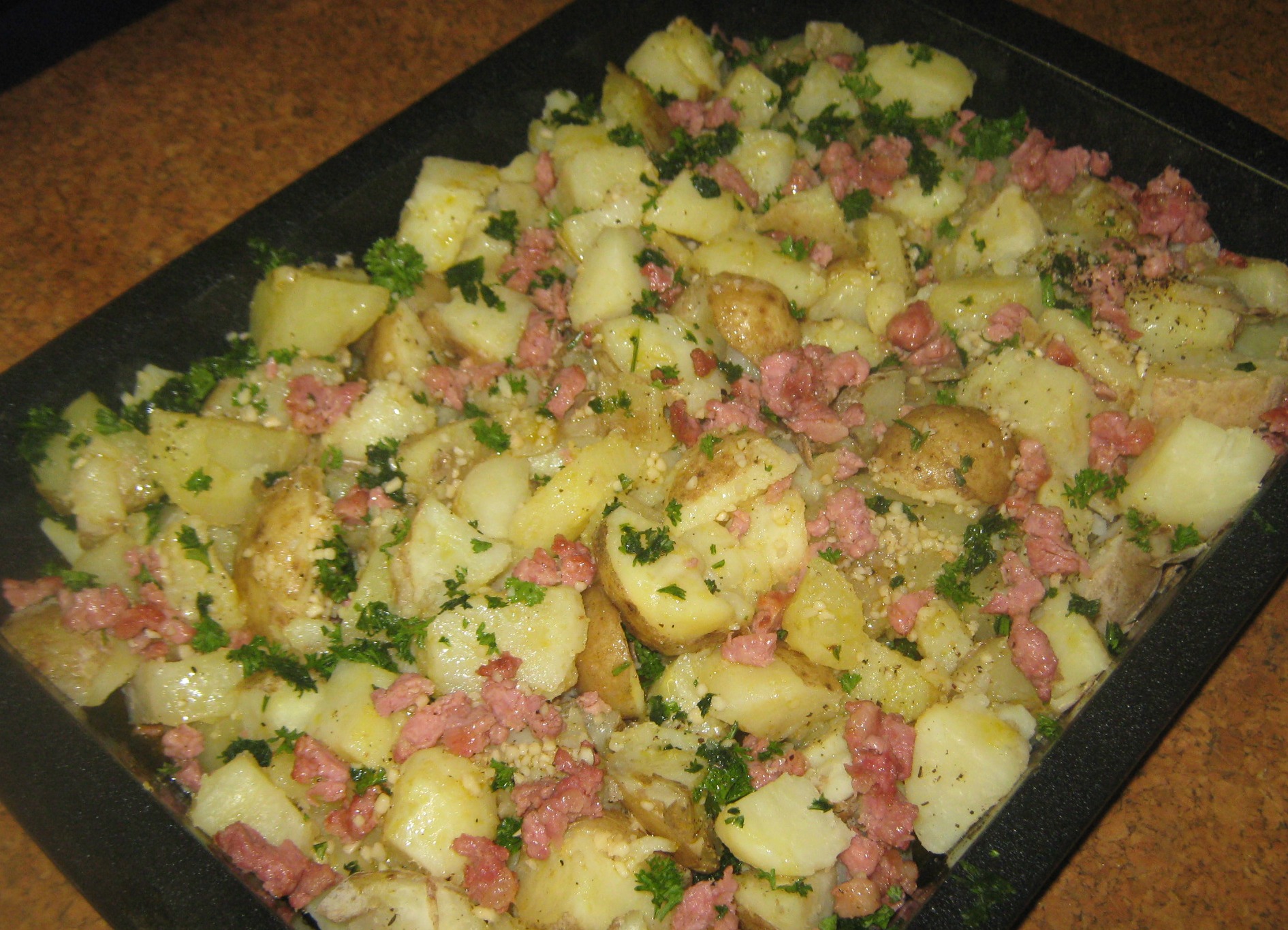 Gooi bo-oor die aartappels, sprinkel die spek oor en vars gekapte pietersielie of spruituie.