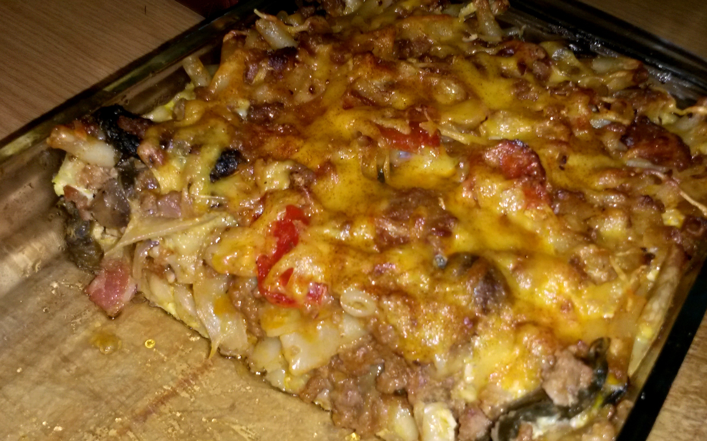Pak boereworsskyfies in ‘n oondvaste bak en skep aartappelmengsel oor.