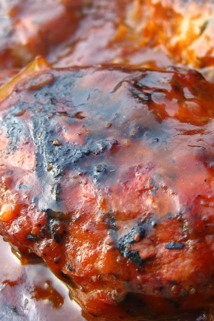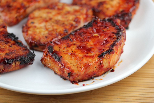 Step 3: Grease the grill grates of an outdoor grill and heat the grill to medium-high heat. Place pork chops onto the grill, and cook (while basting with the sauce often) for about 5 minutes on each side or until the meat is cooked through.