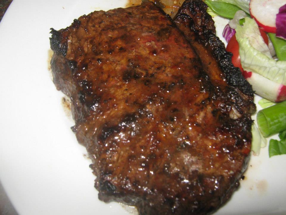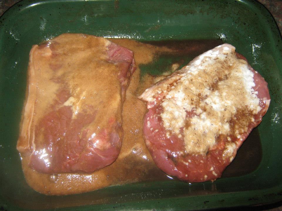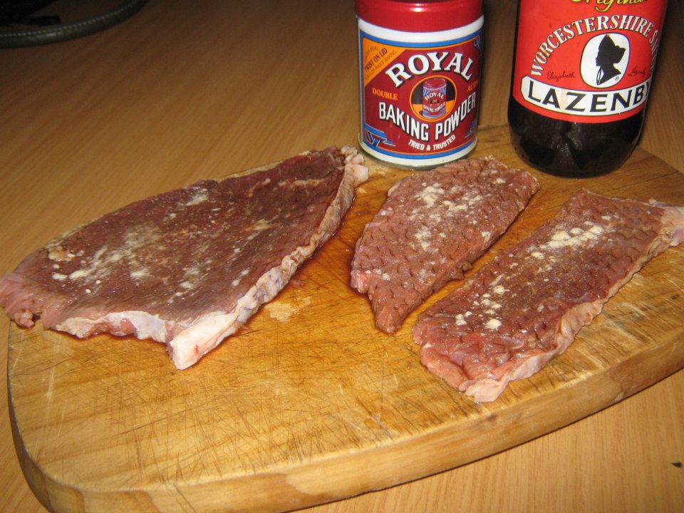 Marineer  steaks so vir ‘n rukkie in worstersous, suurlemoensap en bakpoeier.