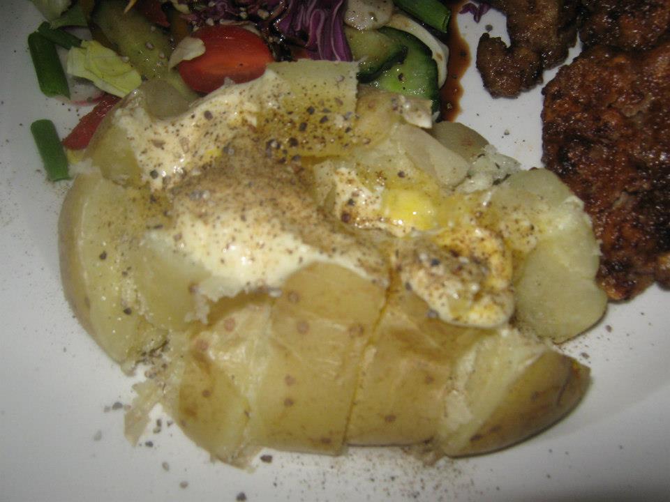 Kook sommer in die mikrogolf in ‘n plastieksak – 2/3 groot aartappels . Prik gaatjies in die aartappel.  Mikrogolf so om en by 8 min- gee dan  staantyd van so 3 minute binne in die mikrogolf, moenie die deur oopmaak nie. Dien aartappels dadelik op na 3 minute staantyd, moenie dit vir ‘n ruk in die mikrogolf laat le nie, anders raak dit taai en verimpeld soos ou skoene. Indien jy sien die aartappels is nog hard, mikrogolf weer so ‘n minuut of 2 – dien op.