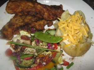 Druk steak in meel, dan in eier, weer in meel – gooi sout en peper oor – plaas vir so 20 min in yskas.  Sit in pan wat se olie reeds warm is – die olie moet nie… koud wees nie anders le jou vleis en degie in die koue olie en val die degie van die vleis af.