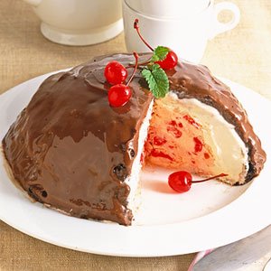 Kap neute en kersies. Breek beskuitjies in klein stukkies. Rasper sjokolade. Klits die room tot styf. Meng al die bestanddele goed en skep in ‘n gesmeerde rondebak en vries. Net voor opdiening: Versier met melksjokolade-ganache en kersies. Ek dink as mens neute skokolade smelt met bietjie room en die oorgooi gaan dit net sooo lekker wees.