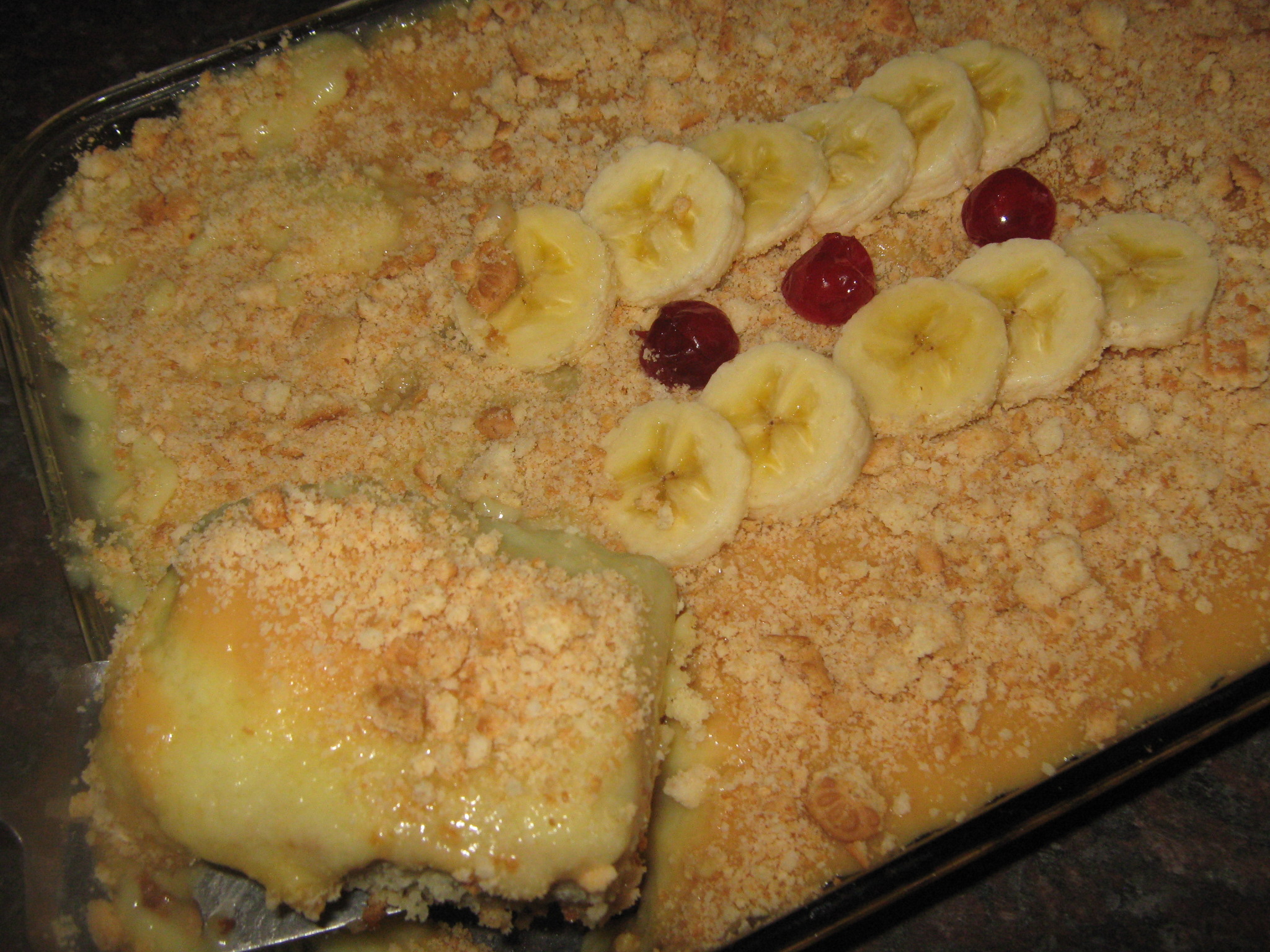 Pak tennis beskuitjies onder in’n bak, gooi mengsel oor, pak weer lagie tennis beskuitjies, weer lagie mengsel, – voltooi tot alles klaar is.